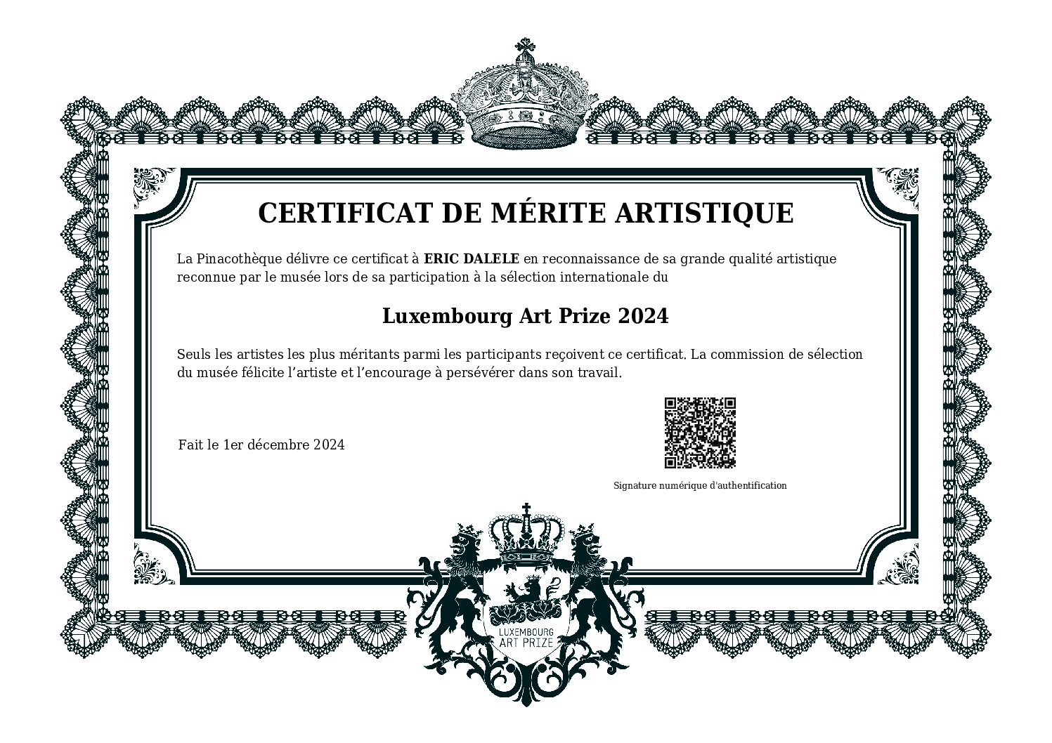 Certificat délivré par la Pinacothèque en reconnaissance de la grande qualité artistique de mon travail, sélectionné parmi les candidats internationaux du Luxembourg Art Prize pour les sessions 2021 et 2024.